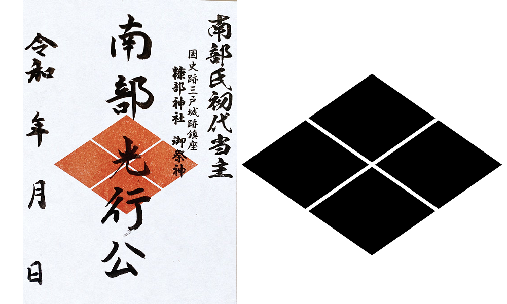 糠部神社の御祭神・南部光行公の名を揮毫した武将印。光行公の時代の家紋は、現在では有名な「南部向鶴」ではなく「武田菱」でした。