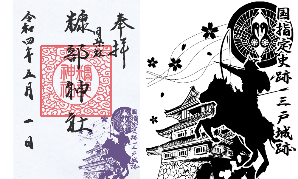 三戸城跡の国史跡を記念して奉製した印。温故館、桜、向鶴、名馬の産地、流鏑馬、南部氏を盛り込んだ三戸感溢れるデザインです。