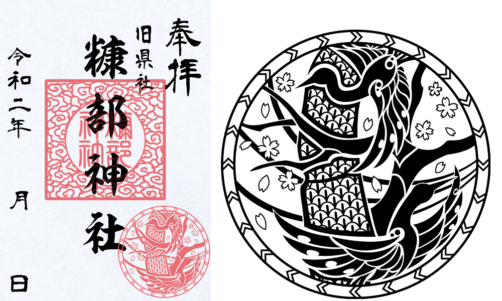 当神社境内の松生桜のイメージを背景に、南部氏の家紋「向鶴」をモチーフに、二羽の鶴を羽ばたかせたデザイン。